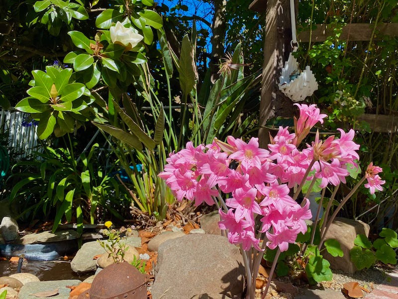 After the nigella, sunflowers, calendula, and poppies finished blooming and I cut them to the ground, my garden looked sullen and sad. Within a few days of the hot weather, the Naked Ladies sprang to life, turning the landscape and hillside into a spectacular sea of undulating pink lilies. Every day, I celebrate the glorious spectacle that erupted as if overnight.
