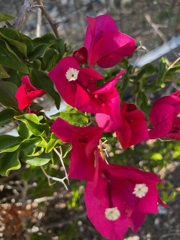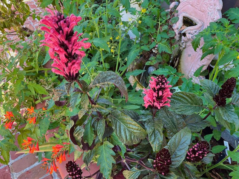 Bougainvillea, hollyhocks, and magnolia flowers have been putting on a show this summer. Tomatoes entwine with Jacobina and crocosmia in a planter while basil grows in nearby pots.