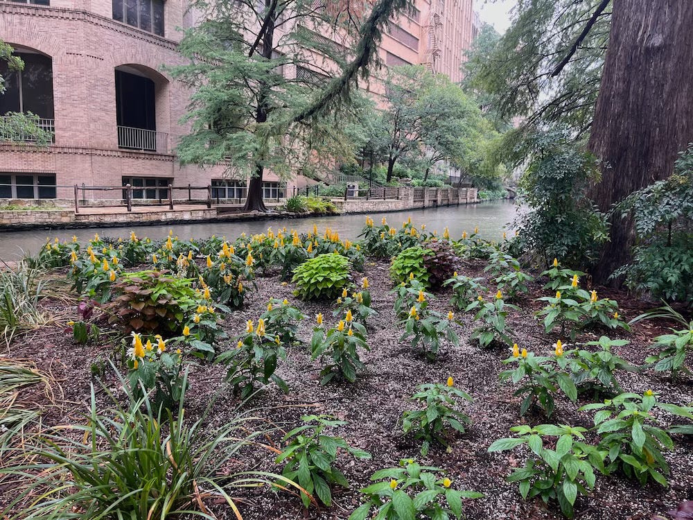 The Golden Shrimp plant, which grows well in Lamorinda in the summer months, was planted throughout the Riverwalk gardens. It is a Hardiness zone 9 plant that thrives in heat and humidity. San Antonio has both. Because it is a tropical plant, in our area, we need to bring it indoors or apply mulch to protect it from frost or colder temperatures.